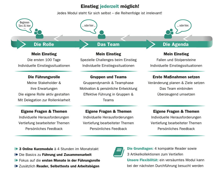 Das Training besteht aus drei Online-Kurzmodulen – Die Rolle, Das Team, Die Agenda – à 4 Stunden, wobei jedes Thema für sich selbst steht. Die Reihenfolge, in welcher Sie die Themen absolvieren, spielt dabei keine Rolle.